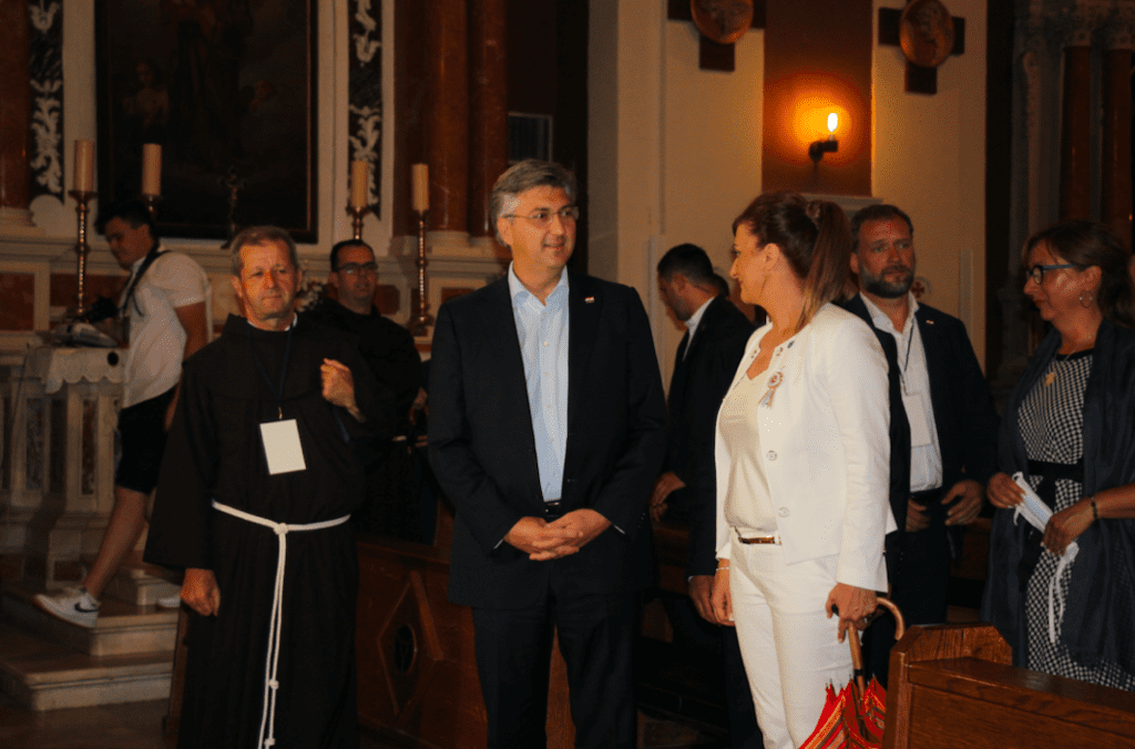 No, kiša je trajala kratko i kao i svake godine, premijer Plenković, predsjednik i dopredsjednik Hrvatskog sabora, ministrice i ministri zajedno s gradonačelnicom Sinja Kristinom Križanac i županom Splitsko-dalmatinske županije Blaženkom Bobanom u koloni su se uputili prema Svetištu Majke Božije Sinjske.