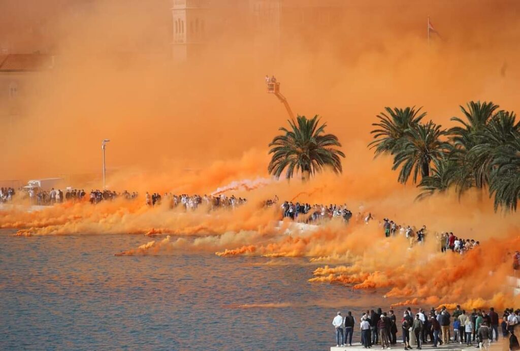 Torcida slavi 70-ti rođendan, nije to šala, a Split će to pamtiti generacijama. No, više od riječi, više od srca koje živi za Hajduka koji živi vječno, govori slika. 70 baklji pretvorilo je na kratko Rivu u narančastu boju.
