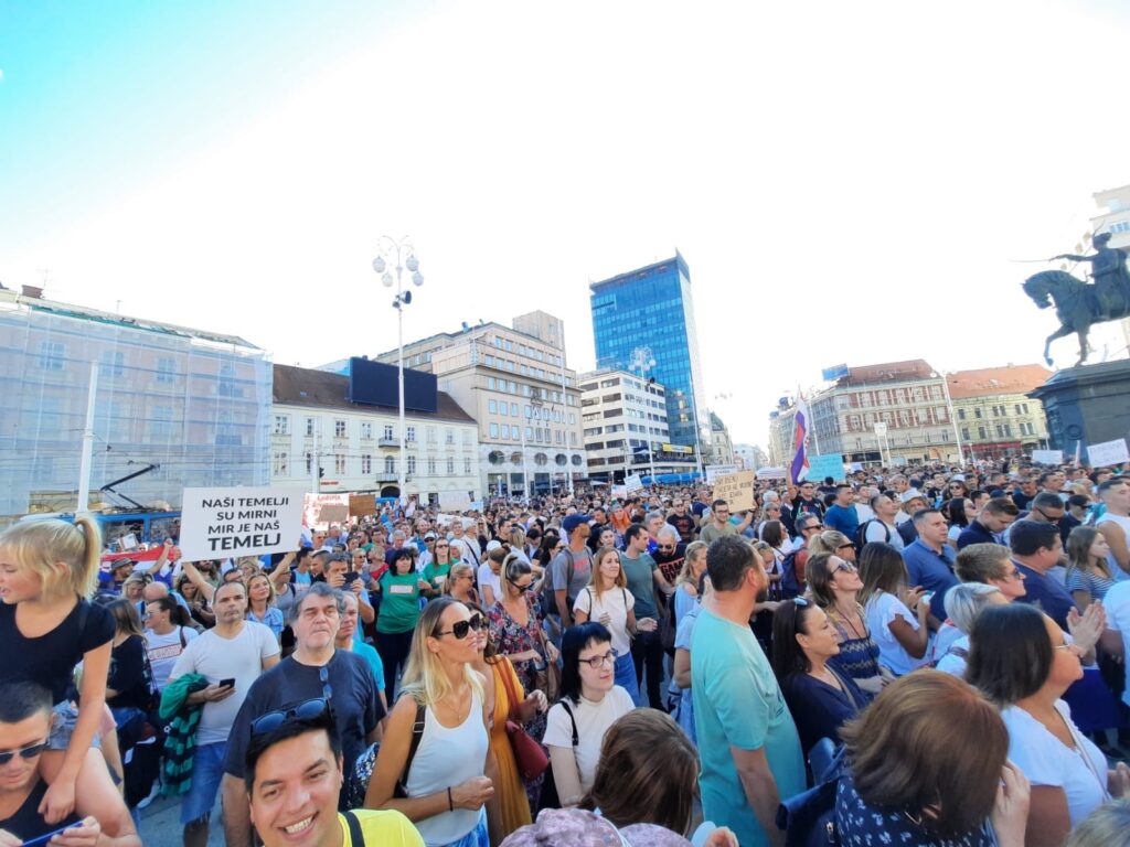 Više stotina ljudi okupilo se na zagrebačkom Trgu bana Jelačića u 17 sati u subotu kako bi sudjelovali na prosvjednom okupljanju “Festival slobode” koji je nastao kao odgovor na mjere za suzbijanje koronavirusa u organizaciji inicijative “Prava i slobode”.