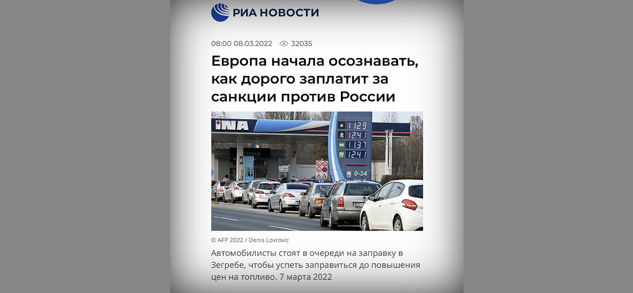 “Europa je počela shvaćati koliko će skupo platiti sankcije Rusiji“, naslov je ruske državne novinske agencije RIA Novosti, koji je napisala novinarka Elena Karajeva.