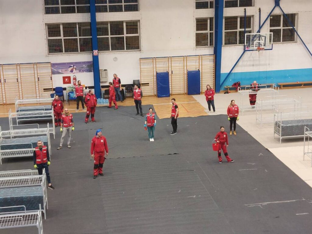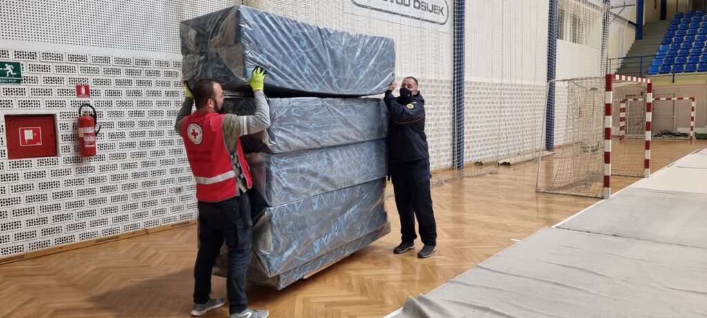 Pripadnici Državne intervencijske postrojbe civilne zaštite Osijek su uz pomoć volontera Gradskog društva Crvenog križa i Društva Crvenog križa Osječko-baranjske županije postavili 100 ležajeva, dopremili posteljinu, pripremili vodu i suhe obroke, namjestili blagovaonicu, te dopremili zaštitna sredstva u sportsku dvoranu Jug 2 u Osijeku za prihvat izbjeglica iz Ukrajine.