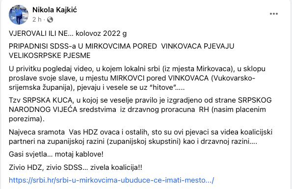 Mirkovački Srbi su godinama bili mirni i tihi, a činilo se čak i lojalni građani Hrvatske, no kako su jačali saborski zastupnici Milorad Pupovac i Dragana Jeckov, pa na kraju i sam SDSS kao koalicijski partner hrvatske Vlade, a njihova djevojčica iz kninske kolone dobila mjesto potredsjednice te iste Vlade, lokalni Srbi opasno su dignuli glave. Rezultat je, eto, i proslava svetog Pantelije u Mirkovcima.