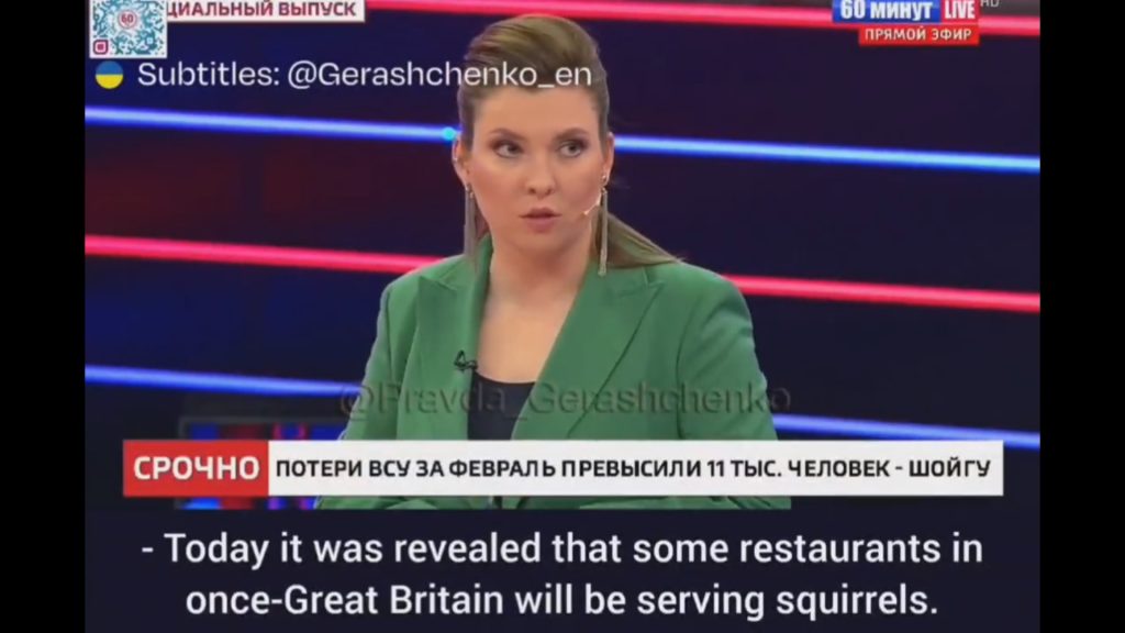 “Danas je otkriveno da neki restorani u Velikoj Britaniji poslužuju vjeverice. Zato što u parkovima ima puno životinja, pa zašto ih ne bi jeli kada vlada nestašica hrane. No i dalje ne posustaju u odluci da pomognu Zelenskom u osiguravanju oružjem“, rekla je Skabejeva.