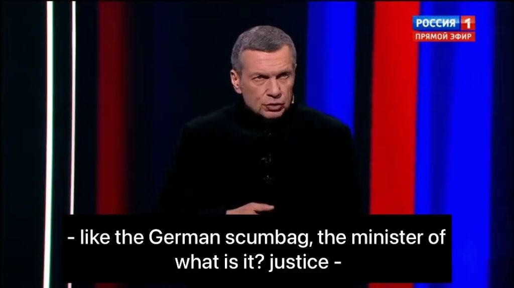 Općenito, bilo koja struktura ili bilo koja država koja se uopće usudi – poput njemačkog smeća, ministra – reći da će pokušati provesti (odluku)… Samo da znaju, svaki pokušaj provedbe je objava rata!” poručio je Solovjov.