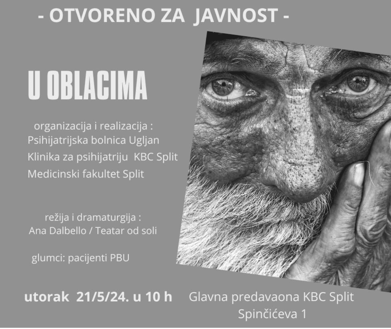 U organizaciji Klinike za psihijatriju KBC-a Split, Psihijatrijske bolnice Ugljan i Medicinskog fakulteta u Splitu, 21. svibnja u 10 sati u Velikoj predavaonici KBC-a Split (Firule, Spinčićeva 1) održat će se dramska predstava „U oblacima“. Glumci su pacijenti Psihijatrijske bolnice Ugljan.