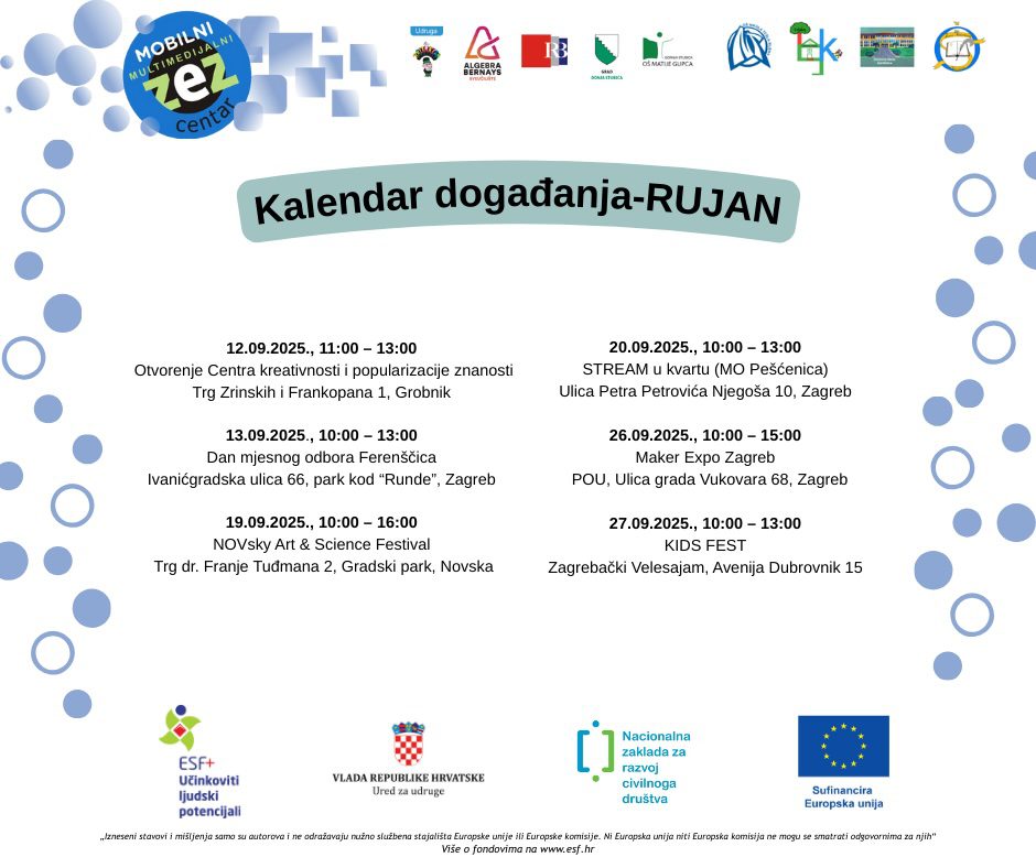 Pozivamo vas da nam se pridružite na radionicama i zajedno s nama istražite čaroliju znanosti, tehnologije i multimedije. Događaji su javni i besplatni te namijenjeni djeci, mladima i svim znatiželjnim odraslima koji žele upoznati nove medije kroz iskustvo, igru i učenje.