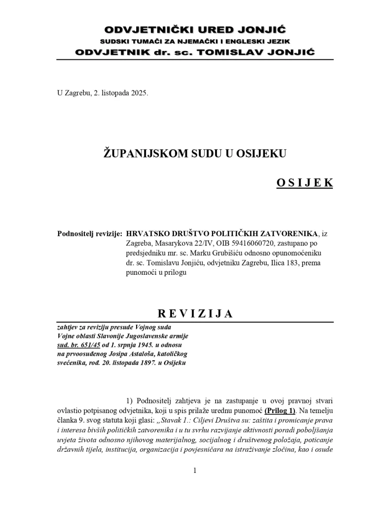 Zahtjev za reviziju podnio je odvjetnik Tomislav Jonjić, zajedno sa sinom Zvonimirom, u ime Hrvatskog društva političkih zatvorenika. Kako je istaknuo, odluku nisu željeli javno isticati prije pravomoćnosti, svjesni mogućih pritisaka i pokušaja osporavanja postupka. “Samu stvar pretpostavili smo jeftinom publicitetu”, naveo je Jonjić, dodajući kako je sada “jedna povijesna nepravda nepovratno ispravljena”.
