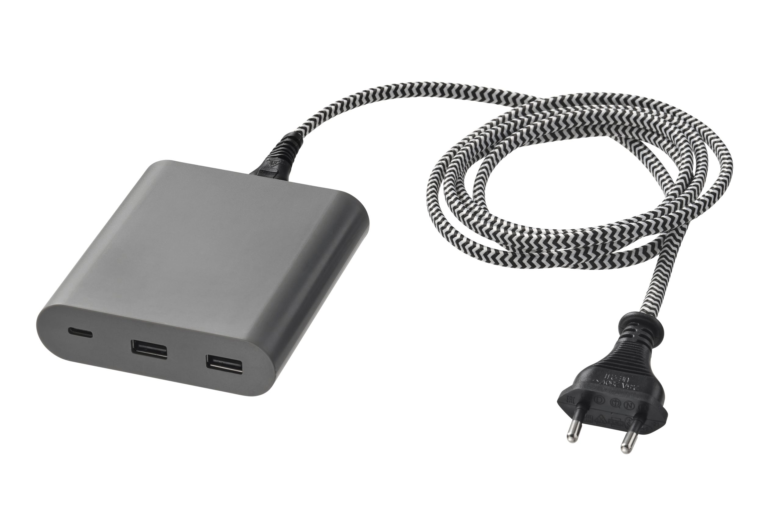 Kabel za napajanje na tamno sivom ÅSKSTORM 40W USB punjaču može se oštetiti ili puknuti uslijed omotavanja oko punjača ili savijanja naprijed-natrag nakon duljeg razdoblja korištenja
