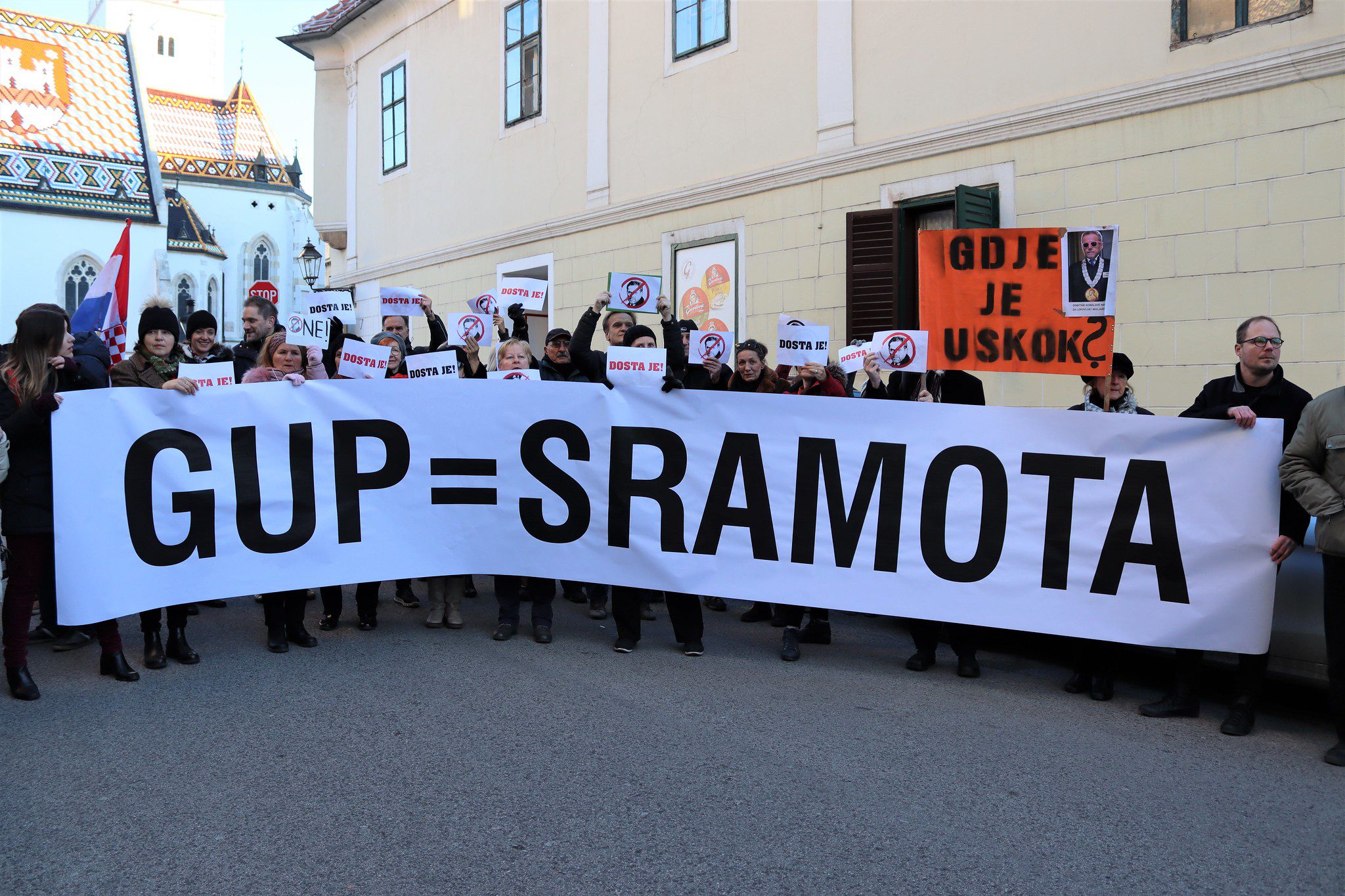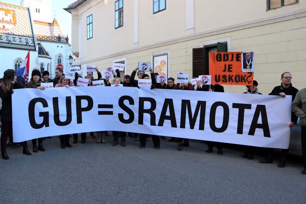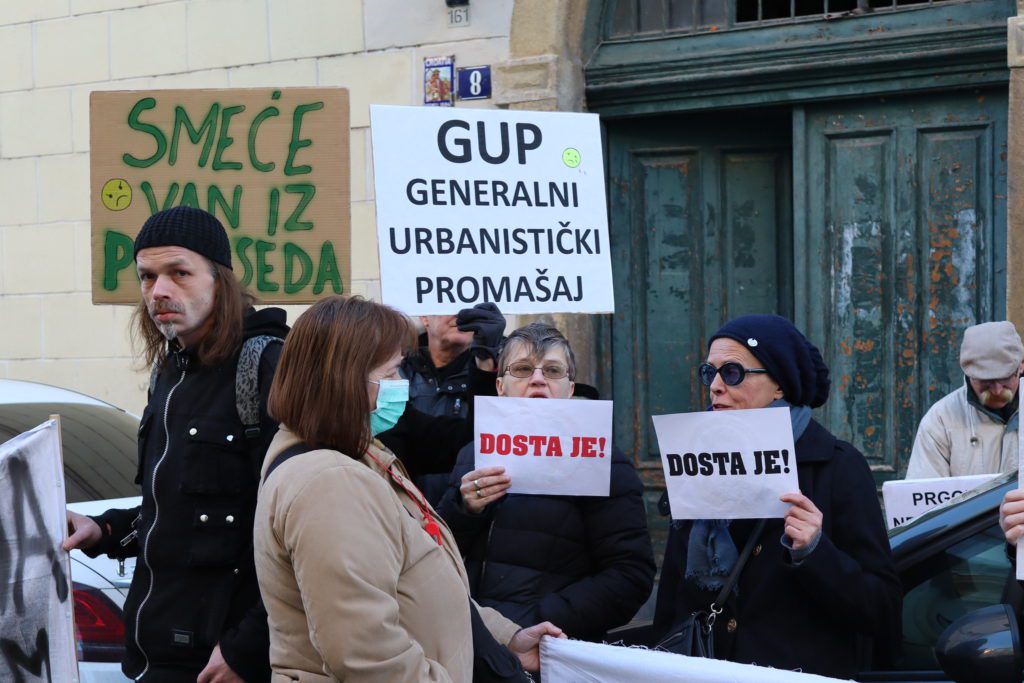 Udruge Zelena akcija, Pravo na grad i Siget, te inicijativa Zagreb te zove, organizatori su toga skupa, s kojega su okupljeni zastupnicima, poglavito iz vladajuće većine, uzvikivali “lopovi“, držeći u rukama transparente na kojima je pisalo: “Dosta je!“, “GUP = sramota“, “I trgovina utjecajem je korupcija“, “Gdje je USKOK?”, “Institucije su stup korupcije“, “Dosta kriminala s planovima“, “Nama smeće, a njima Manhattan?! – ‘Dosta je!‘”.