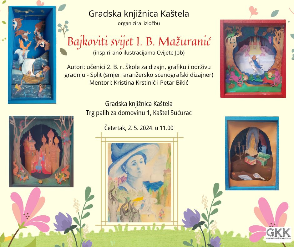 Gradska knjižnica Kaštela povodom 150. obljetnice rođenja najpoznatije hrvatske književnice Ivane Brlić Mažuranić organizira izložbu Bajkoviti svijet I. B. Mažuranić. Radove s motivima Priča iz davnine inspirirane ilustracijama Cvijete Job izradili su učenici 2. B. razreda Škole za dizajn, grafiku i održivu gradnju – Split, smjer aranžersko scenografski dizajner pod mentorstvom prof. Kristine Krstinić i prof. Petra Bikića.