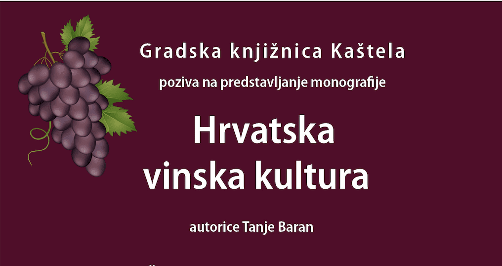 Znanstveno-popularnu monografiju Hrvatska vinska kultura autorice doc. dr. sc. Tanje Baran Gradska knjižnica Kaštela predstavit će u srijedu 26. lipnja 2024. u Gospojskoj štradi u Kaštel Sućurcu s početkom u 20.30 sati.